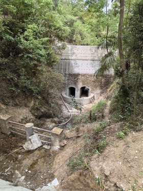 汉中银茂矿业开发有限公司位于陕西省汉中市勉县茶店镇艾叶口村七组,原名陕西勉县金属选矿厂,成立于2008年3月,后于2010年更名为汉中银茂矿业开发有限公司。公司注册资金1000万元,法定代表人谭文平,公司类型为有限责任公司,经营范围包括矿产品(仅限铜、铅、锌矿的开采)加工、销售。初期坝为土石混合坝,坝高20.5m,坝顶高程720.0m,坝顶宽3.0~3.4m,坝顶长度50.34m。初期坝下游坝面710.0m高程马道宽度为2.0m,马道以下外坡比为1:2.84,马道以上外坡比为1:2.55。堆积坝高度为25.0m,堆积坝坝顶标高为745.0m,坝顶长约93.3m,初期坝顶至现状堆积坝顶标高之间共有4级马道,马道顶高程分别为725.0m、730.0m、735.0m、743.0m。安家沟尾矿库排洪系统采用拦洪坝—排洪涵洞的泄洪方式,拦洪坝以上的洪水从涵洞的进口处进入,库区洪水从库区涵洞进水口进流。库区从上游到下游设置拦渣坝、拦洪坝、库区涵洞进水口、排洪涵洞、两岸截洪沟、马道排水沟、竖向排水沟、消力池等防排洪设施。